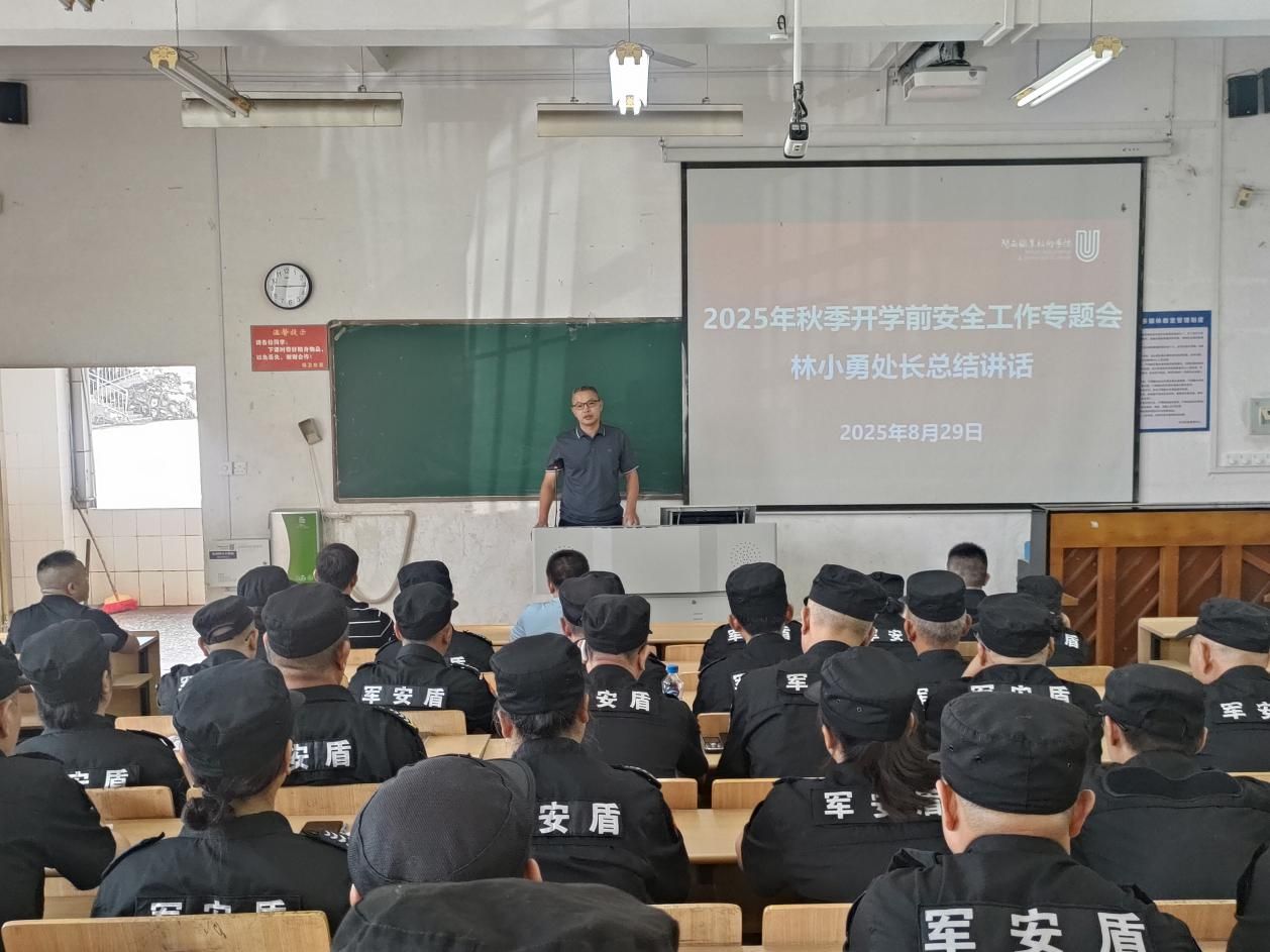 8月29日上午,400白菜导航网在良材楼101室召2025年秋季开学安全工作专题会,安全保卫处全体人员、学生工作处相关人员、消防维保公司相关人员、福建省军安盾保安服务有限公司负责人及全体安保队员参会。