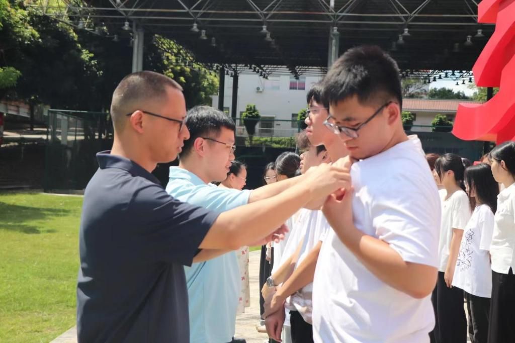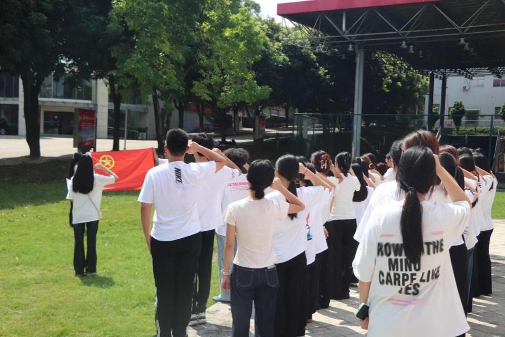 为严格落实《中国共产主义青年团入团仪式仪程规范(试行)》,强化新团员的荣誉意识和责任担当,财经商贸学院团委于2025年9月29日在槟龙球场前的红旗不倒地标处,规范严肃地开展了新团员入团仪式。 仪式包括“奏唱国歌”“说明入团仪式的意义,宣布新团员名单”“颁发礼”“宣誓礼”“新团员代表发言”“优秀团员代表发言”“院团委书记发言”“奏唱团歌”等8项议程。本次入团仪式参与人员有财经商贸学院团委书记、副书记,财经商贸学院社区党支部支委、新团员学生。