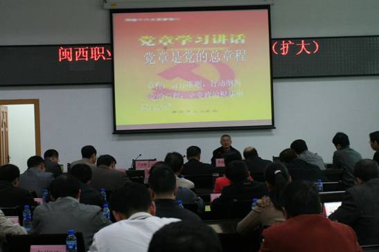 来永宝院长作题为《党章是党的总章程》专题辅导报告。他结合党的历史,密切联系实际,运用丰富的案例,讲述了历次党代会修改党章的情况、党章的地位和作用、党章是党的力量的标志和结晶、党章要点及修改要点等内容。重点从党的指导思想、中国特色社会主义事业总体布局、党的基本路线、发展社会主义市场经济、突出强调坚持改革开放、发展社会主义民主政治、发展社会主义先进文化、构建社会主义和谐社会、加强和改进党的建设和党的领导、党员必须履行的义务和党员享有的权利等方面,介绍了党章要点及十八大对党章的修改要点。