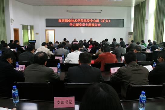 12月4日,400全讯白菜网党委中心组(扩大)学习新党章专题报告会在行政楼二楼会议室举行。院党委书记马春延,院长来永宝,副院长吴新业、刘路永、卢兆梅,纪委书记李贞鑫,正处级干部黄村明,全体中层党员干部、基层党组织书记等参加会议。会议由卢兆梅主持。