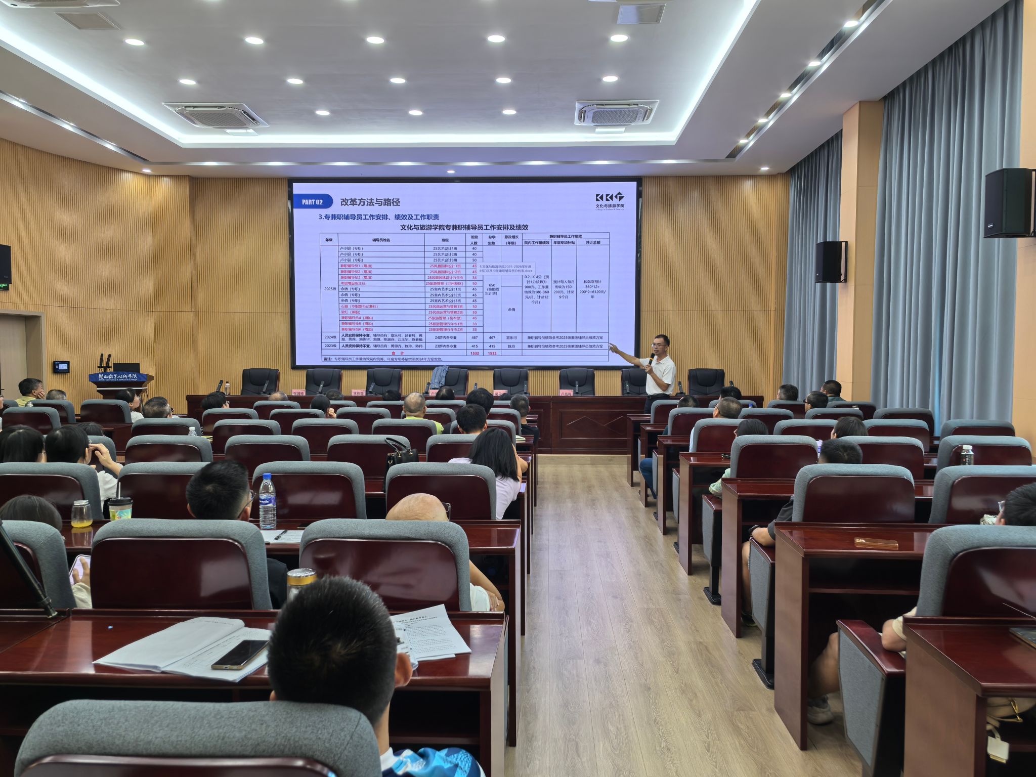 会议伊始,文化与旅游学院党委书记陈荣坤代表各二级学院发言。他紧扣“落实立德树人,践行教书育人”主题,分享了文旅民宿专业群教书育人双融合改革方案。他以文化与旅游学院基本情况和存在问题为切入口,全面地阐述了人才培养模式改革、教学组织改革、教书育人改革等实施路径,通过创新“四维融合、双轨四阶”线上线下混合式教学形式,优化学生思政队伍结构和三全育人工作机制,努力实现“模块重构”“双轨融通”“数智强师”“专思协同”等四大成效。