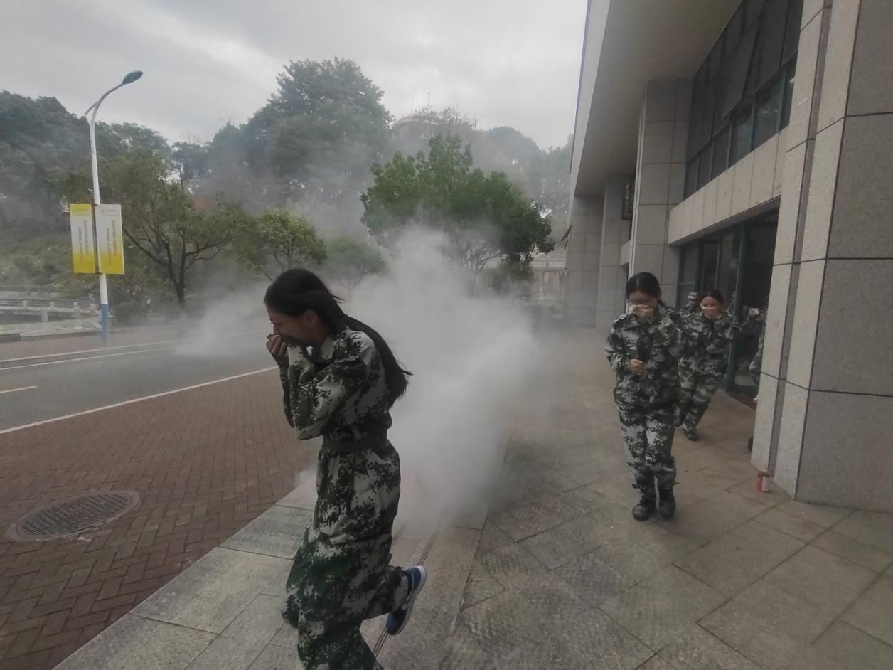 演练前,指挥部明确分工,后勤保障组负责场地布设、治安警戒、应急救护及信号发布,宣传报道组统筹前期宣传、现场记录与总结材料撰写。随着模拟火灾警报响起,烟雾弹释放模拟烟雾,各学院辅导员和消防志愿者引导新生用湿毛巾捂住口鼻、弯腰低姿,沿预定路线快速有序疏散至集结区域。后勤保障组同步检查场地设施与物资,确保疏散环节安全无遗漏。
