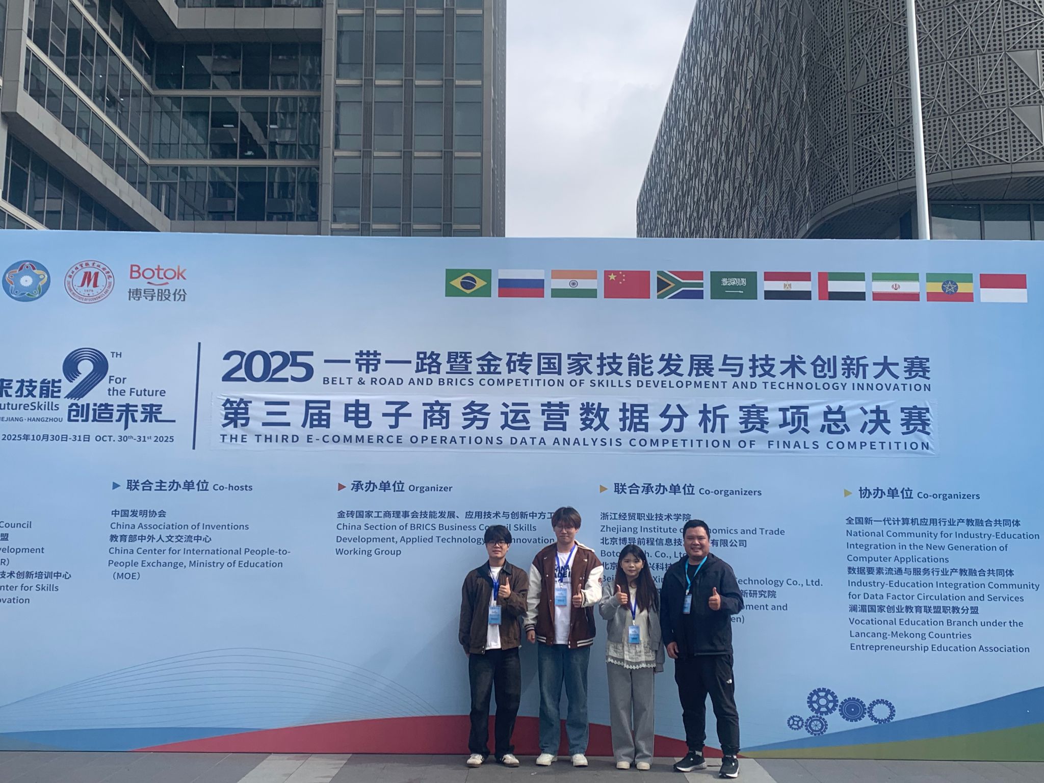 10月31日,2025年一带一路暨金砖国家技能发展与技术创新大赛电子商务运营数据分析赛项全国总决赛在杭州圆满落幕。本届大赛规模空前,共吸引来自中国、泰国、越南、俄罗斯等国家的88所院校117支队伍齐聚浙江经贸职业技术学院,参与决赛角逐。由400白菜导航网财经商贸学院张赠富、赖春星老师指导,电子商务专业俞嘉乐、薛中恒、陈玉婷三位同学组成的参赛团队,凭借扎实的专业技能和出色的临场发挥,在强手如林的赛场上脱颖而出,荣获全国总决赛二等奖的优异成绩!