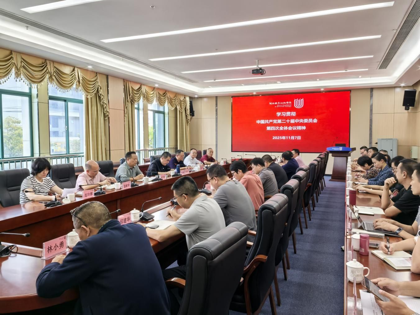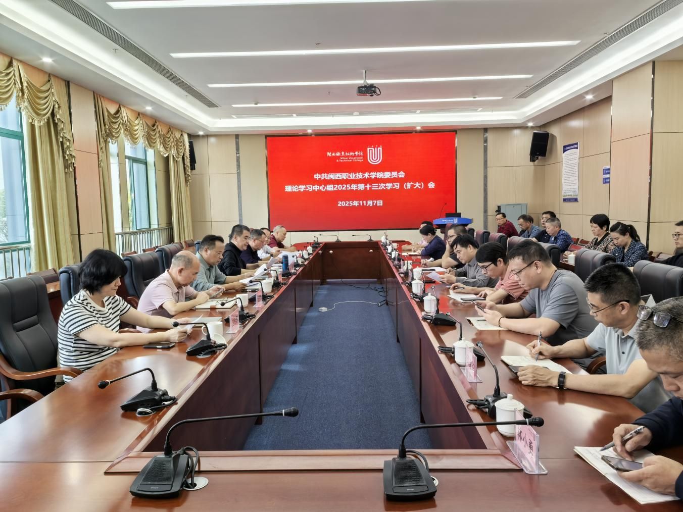 11月7日下午,校党委理论学习中心组在岩声楼二楼召开2025年第十三次学习(扩大)会,专题学习中国共产党第二十届中央委员会第四次全体会议精神。校党委书记卢伟耀,校党委副书记、校长梁俊平作专题发言,中心组成员聚焦学习内容作交流发言,校党委书记卢伟耀主持学习会并领学《中国共产党第二十届中央委员会第四次全体会议公报》。