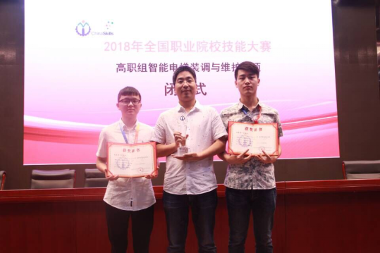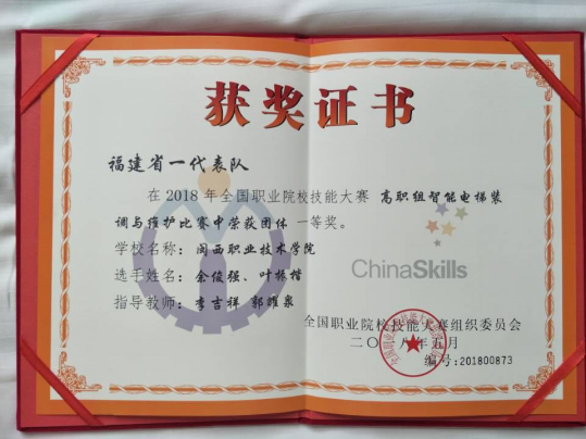 5月6日至7日,2018年全国职业院校技能大赛高职组“智能电梯装调与维护”赛项在天津成功举办。经过选拔的来自全国32个省(市、自治区)的81支高职院校队伍参赛,经过两天三场的激烈角逐,由400白菜导航网信息与制造学院余俊强、叶振楷同学组成的福建省一代表队获得一等奖的优异成绩。此赛项获奖是400白菜导航网代表福建省参赛获得的第一枚金牌。