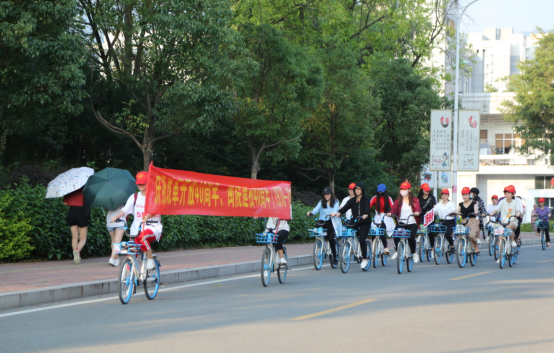 骑行队由教育系党总支负责人带队,30名学前教育专业青年志愿者组成,从西大门、教学综合楼、实训楼、行政楼、学生宿舍环绕一圈进行宣传。