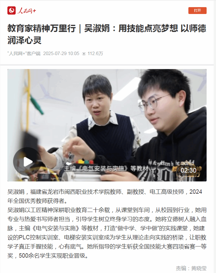 吴淑娟以工匠精神深耕职业教育二十余载,从课堂到车间,从校园到行业,她用专业与热爱书写师者担当,引导学生树立终身学习的态度。她将立德树人融入血脉,主编《电气安装与实施》等教材,打造“做中学、学中做”的实践课堂,她建设的PLC控制实训室、电梯安装实训室成为学生从理论走向实践的桥梁,让职教学子真正手握技能,心有底气。她所指导的学生斩获全国技能大赛四项省赛一等奖,500余名学生实现职业晋级。