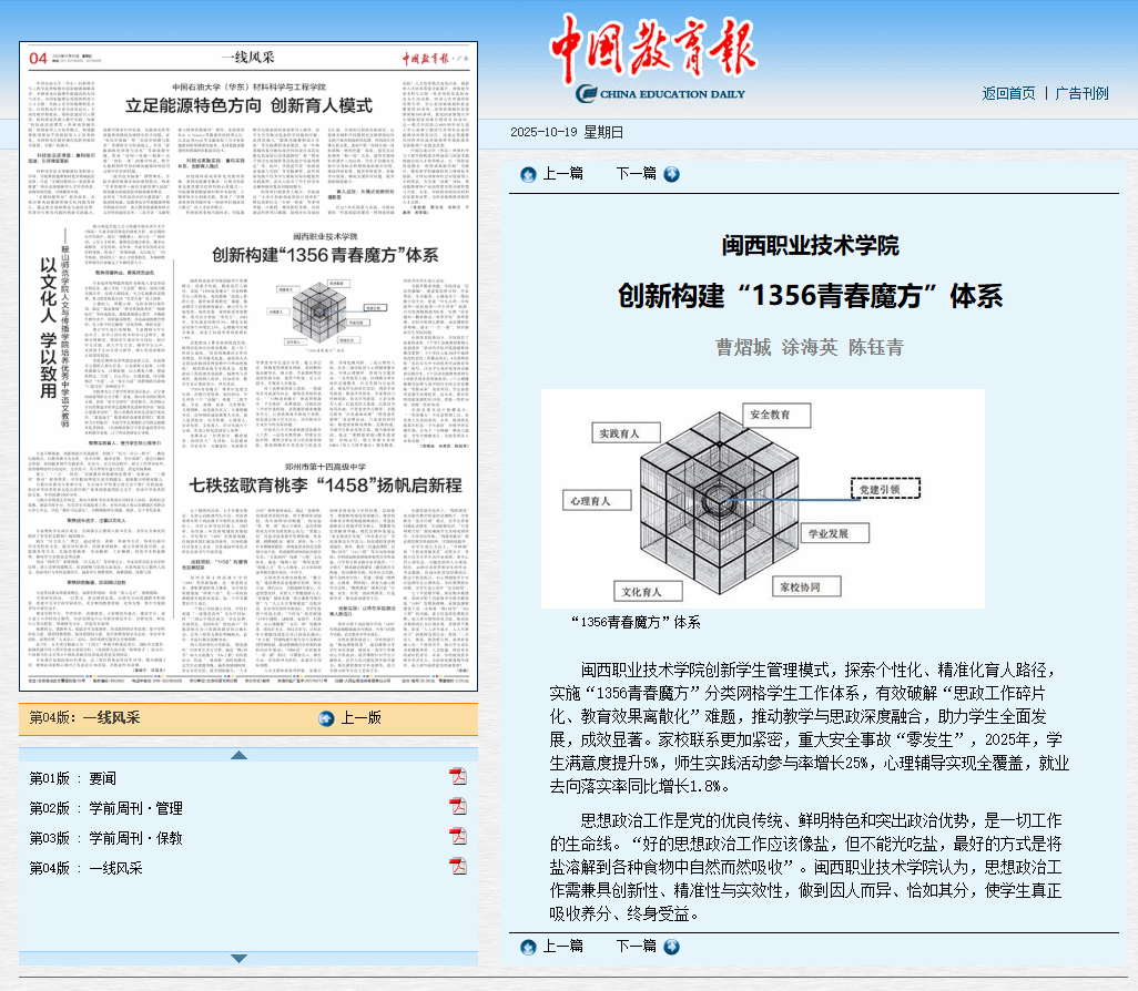 “1356青春魔方”体系以党建为引领,围绕分类管理、家校协同、学生评价三个“动轴”,构建“二级学院、专业、班级、宿舍、分类群体”五级网格,由党政负责人、专兼职辅导员、训导师组成思政育人小组,深入党团教育、安全管理、心理育人、学业发展、文化育人、社会实践六个方面,形成立体化思政育人矩阵。