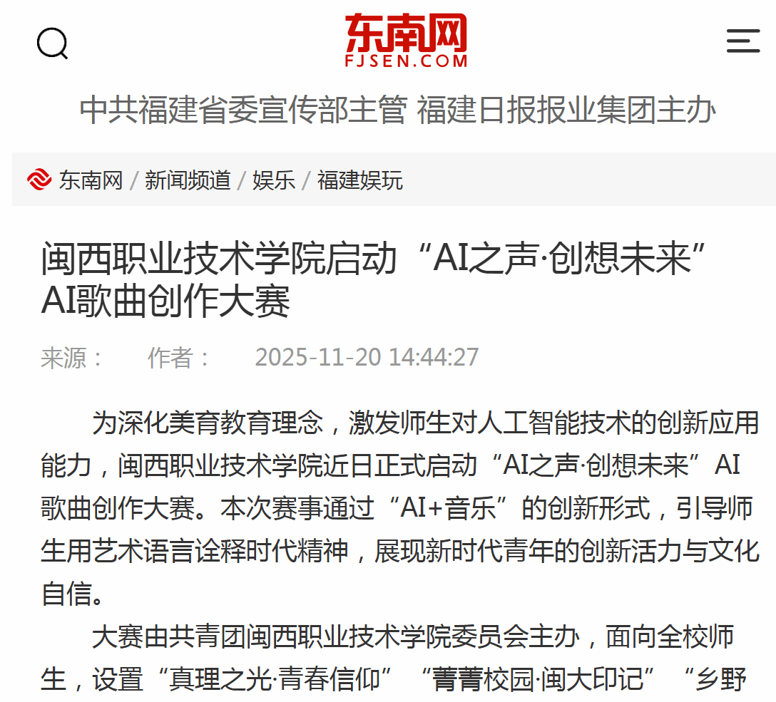 为深化美育教育理念,激发师生对人工智能技术的创新应用能力,400全讯白菜网近日正式启动“AI之声·创想未来”AI歌曲创作大赛。本次赛事通过“AI+音乐”的创新形式,引导师生用艺术语言诠释时代精神,展现新时代青年的创新活力与文化自信。