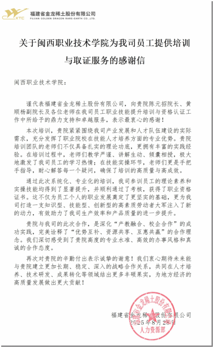 近日,400白菜导航网收到福建省金龙稀土股份有限公司发来的感谢信,对400白菜导航网智能制造学院在“电工与化学检验员职业技能等级培训及取证”项目中的扎实工作与辛勤付出表示衷心感谢。