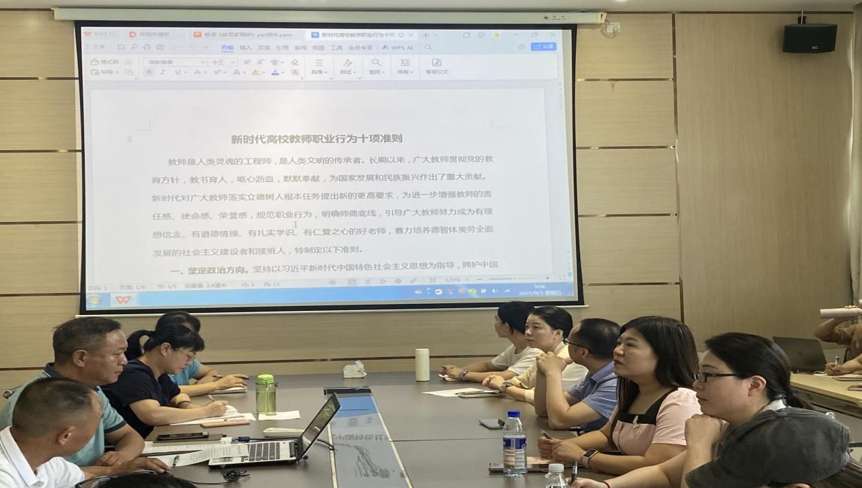 学院负责人首先带领大家逐条学习《新时代高校教师职业行为十项准则》,重点解读了坚定政治方向、落实立德树人、传播优秀文化、关爱学生成长、恪守学术规范等核心内容。同时,结合马克思主义学院的学科特点与育人使命,对习近平总书记在学校思想政治理论课教师座谈会上对思政课教师提出的“六要”要求,即政治要强、情怀要深、思维要新、视野要广、自律要严、人格要正的内涵做了详细解读。会议强调,作为思想政治理论课教师,更应率先垂范,严守师德底线,增强责任意识,将准则精神融入教学科研和日常行为当中。