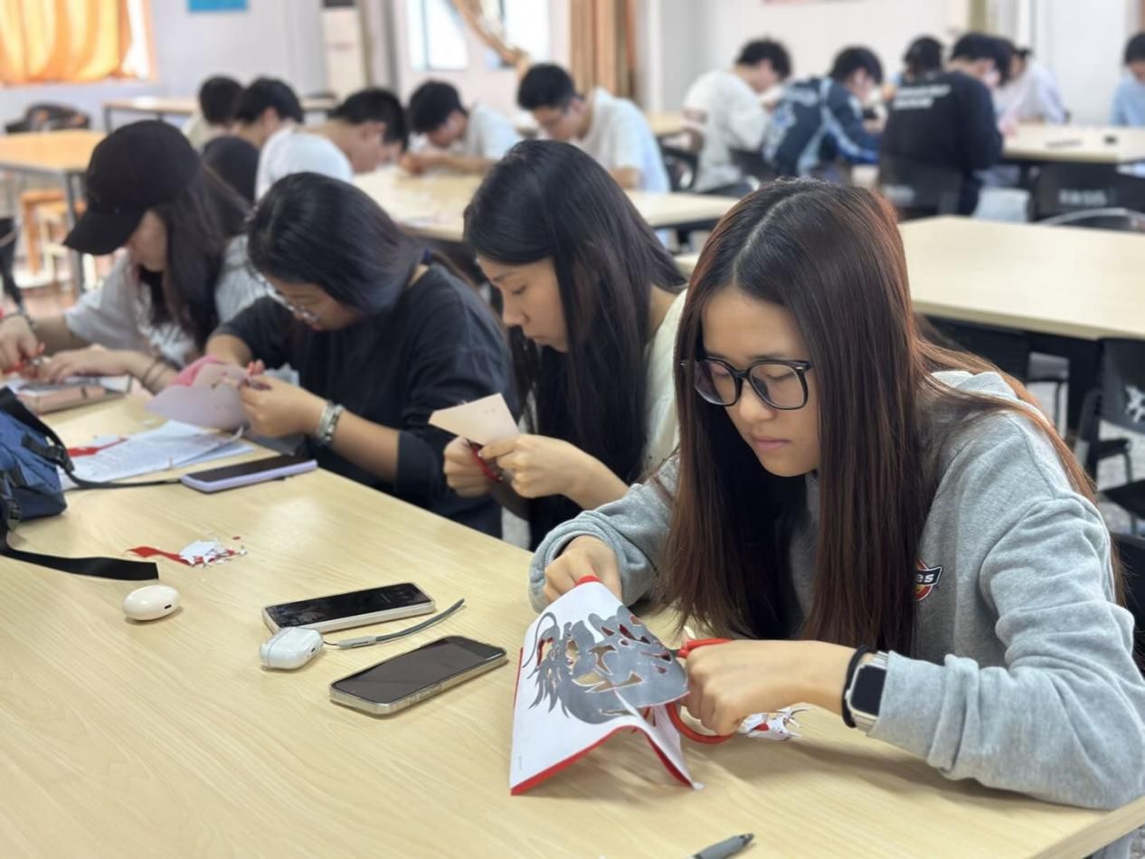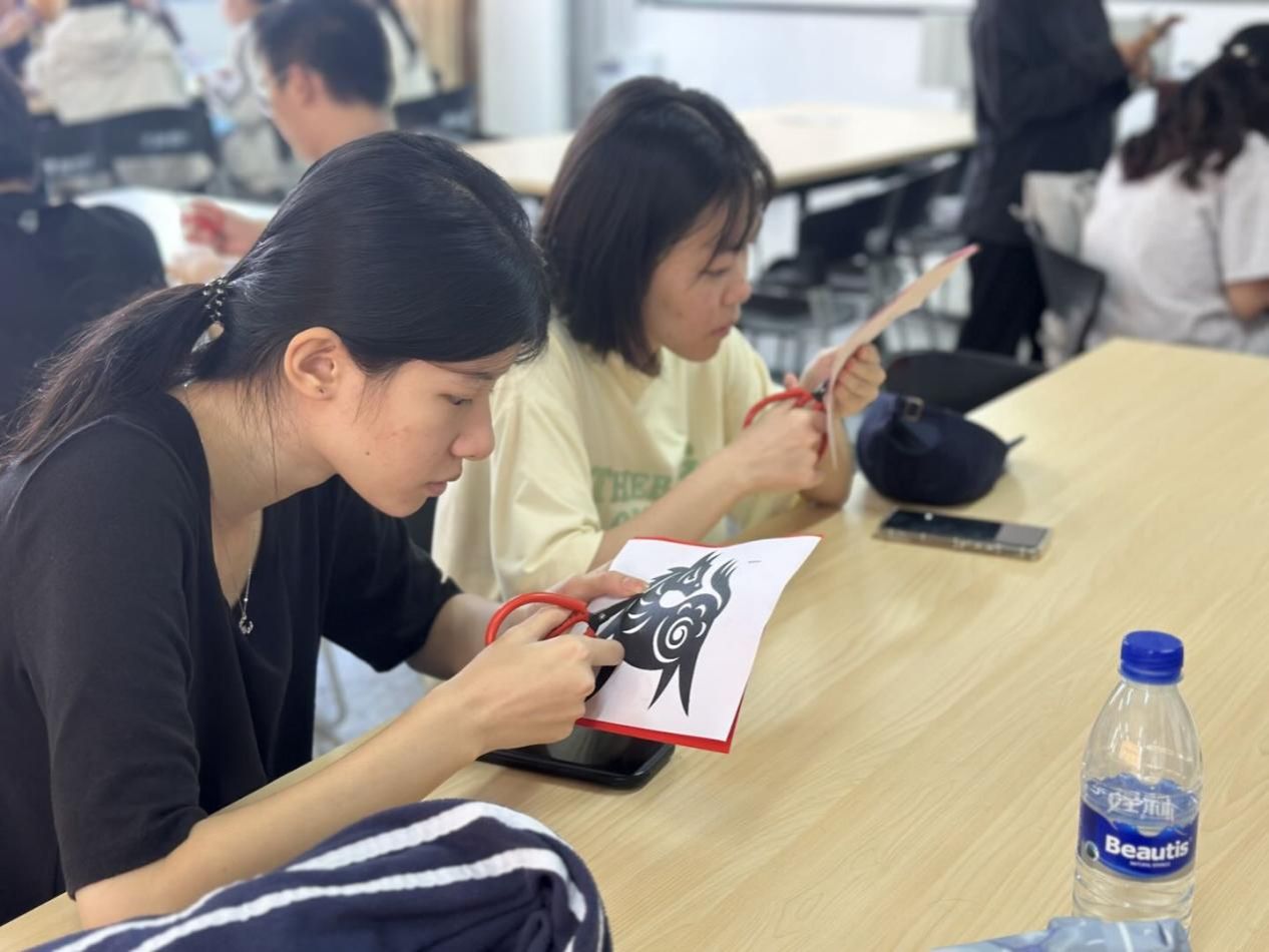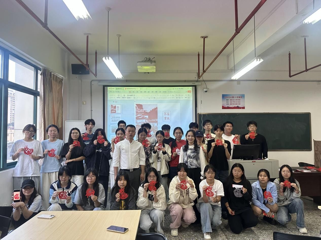 讲座中,刘建斌老师不仅深入浅出地讲解了客家剪纸的历史渊源与艺术特色,更在现场指导学生亲手体验剪纸技艺。同学们在刘老师的细致指导下,纷纷动手实践,完成了各具特色的剪纸作品,近距离感受了非遗文化的独特魅力。