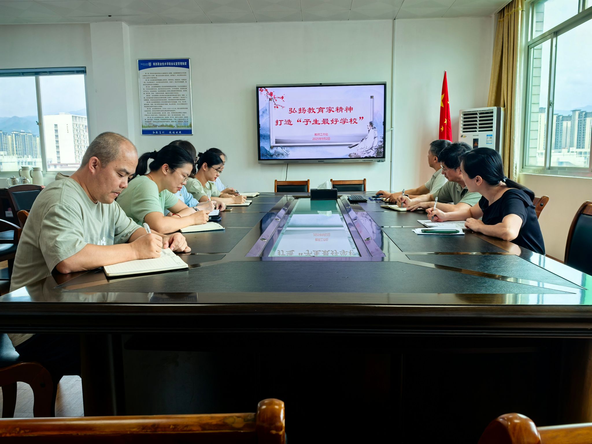 9月2日,教师工作处召开弘扬教育家精神专题学习会。教师工作处负责人以《弘扬教育家精神 打造“予生最好学校”》为题作专题报告,从六个维度深入解读教育家精神的要义和内涵,结合全国及学校优秀师德典型事迹和教师工作处实际阐述了践行教育家精神的路径——内化、弘道、锻造。