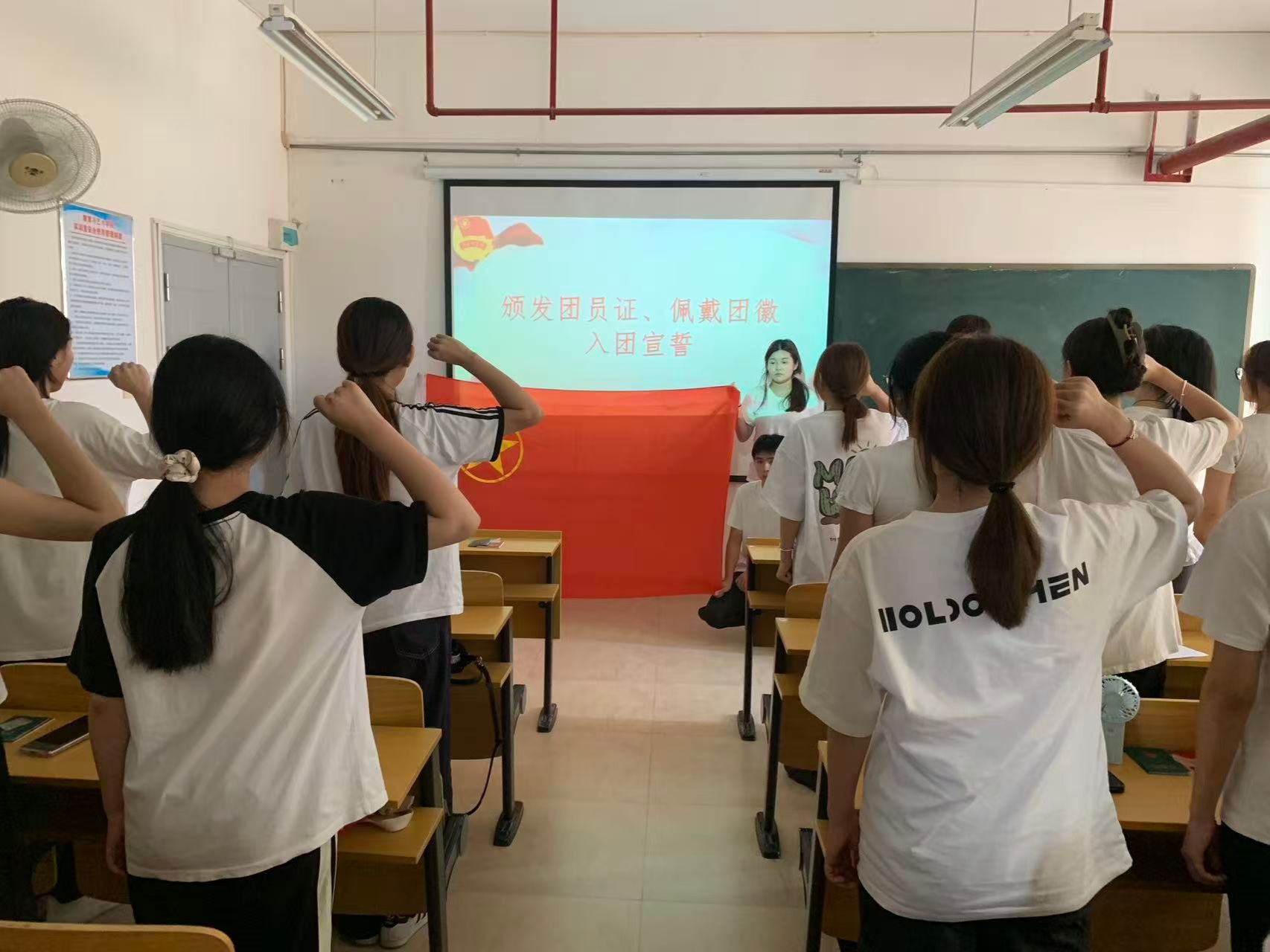 上午十点,入团仪式在庄严的国歌声中拉开帷幕。首先,汪城杰宣读了入团仪式的重要意义,并郑重宣读本次新团员名单。这份名单标志着新团员们正式开启人生新征程。加入中国共产主义青年团,不仅是他们人生中的一个重要里程碑,更是成长道路上的全新起点。随后,老团员为新团员们佩戴团徽。闪耀的团徽,象征着共青团的光荣与使命,它将激励着新团员们不断进步,为实现中华民族伟大复兴贡献自己的力量。佩戴好团徽后,在汪城杰的带领下,团员们面向团旗,庄严宣誓。铮铮誓言,响彻教室,表达了他们对共青团的忠诚和为共产主义事业奋斗的坚定决心。最后,团委书记黄庆春发表讲话,他对新团员们表示热烈祝贺,并提出了殷切期望。希望新团员们牢记入团初心,在学习和生活中发挥模范带头作用,努力提高自身素质,为学院争光,为共青团添彩。