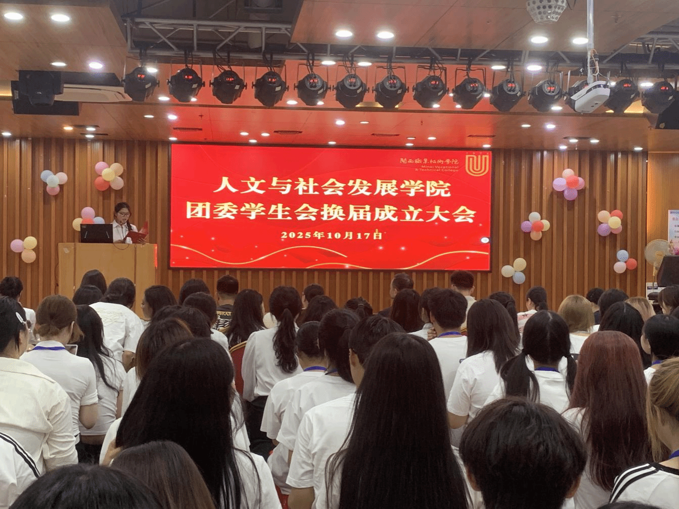 2025年10月16日,人文与社会发展学院在岩声楼十楼隆重召开第一届团委学生会换届成立大会。此次大会由学生会执行主席张韩主持,出席本次大会的有院长李文春、院党委副书记黄翠宝、团委书记黄庆春、学院辅导员刘观金、胡丹、黄磊以及院团委学生会全体新老学生干部、干事。