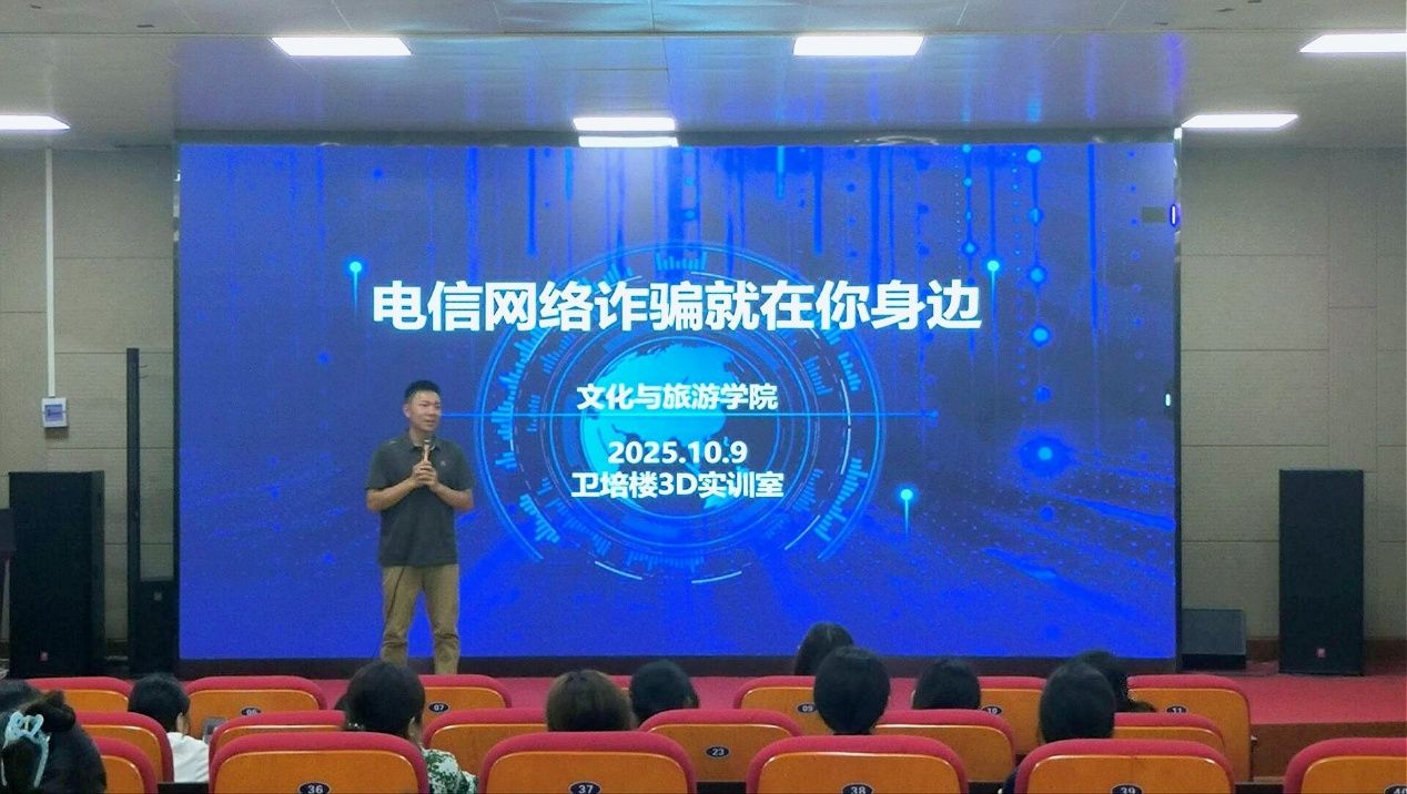 2025年10月9日,文化与旅游学院在卫培楼3D实训室举办了“电信网络诈骗就在你身边”主题宣讲活动,是学院推进校园安全教育系列工作的重要一环,旨在全面提升师生对当前高发电信网络诈骗的识别与防范能力。