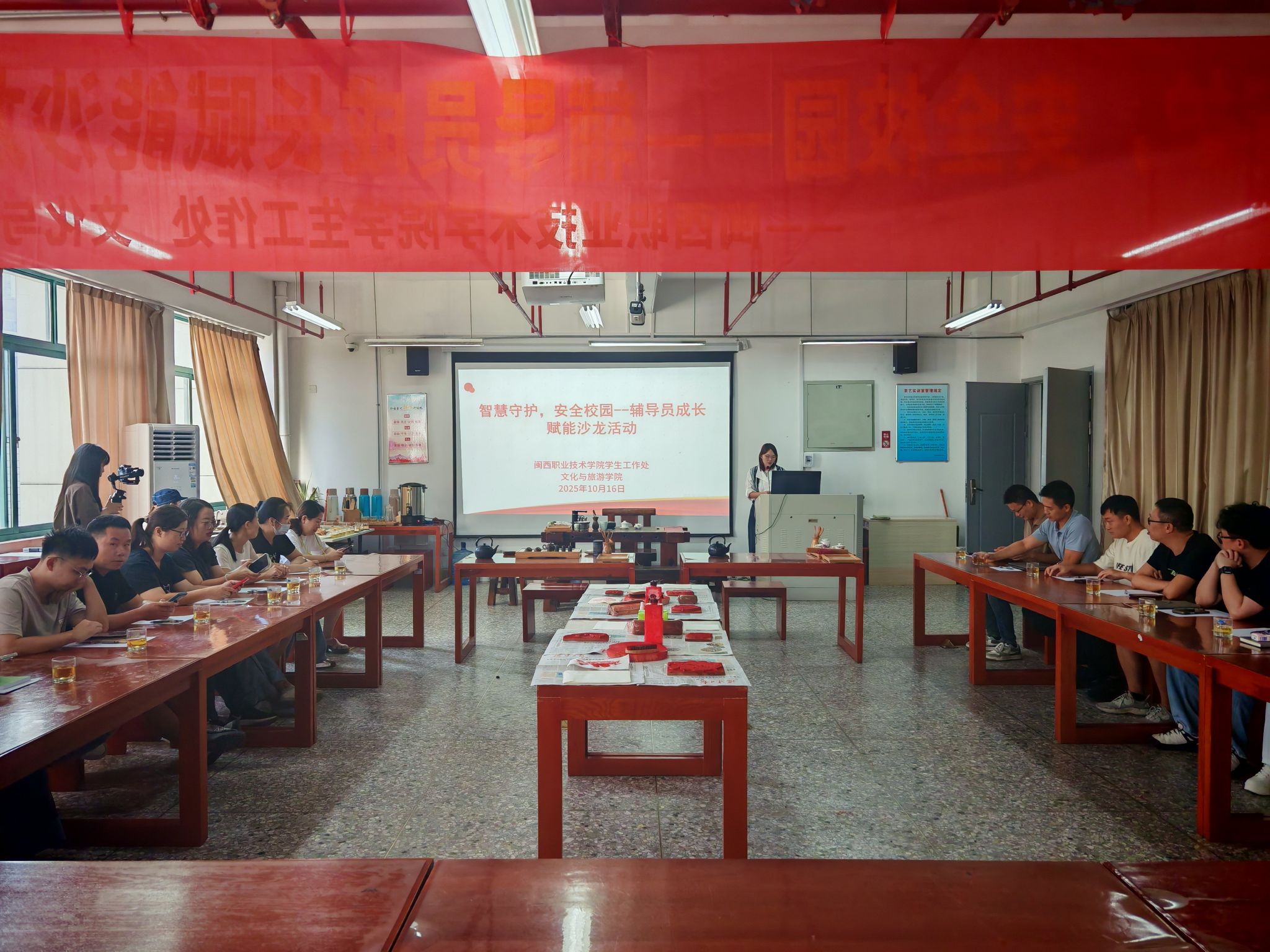 10月16日下午,学院万源楼702茶艺室摇身一变,成了安全的“智慧岛”。一场别开生面的辅导员沙龙交流会,由学生工作处精心策划,文旅院倾情承办,400全讯白菜网副校长连玲娜、校团委书记陈愉、学工处处长曹熠城、学工处副处长王阳根、文旅院党委书记陈荣坤、文旅院学工工作负责人石颖及20多位辅导员齐聚一堂,在茶香袅袅与雕版印刷的古韵中共赴这场安全与智慧的双重盛宴。