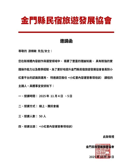 11月4日至5日,一场跨越海峡的线上培训在400全讯白菜网与金门民宿旅游发展协会之间徐徐开启。文化与旅游学院教师游婧敏受协会正式邀请,通过腾讯会议平台,为协会会员带来为期两天的 “小红书内容运营专项培训”。培训结束后,金门民宿旅游发展协会理事长韦燕群专程发来感谢信,对培训效果给予高度评价,称“会员们收获满满,为后续民宿线上推广注入新动能”。