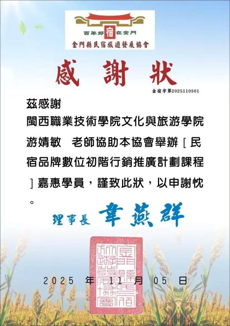 培训结束后,金门民宿旅游发展协会理事长韦燕群发来感谢信。信中写道:“本次培训内容精准对接金门民宿行业需求,既有理论高度,又有实操深度。